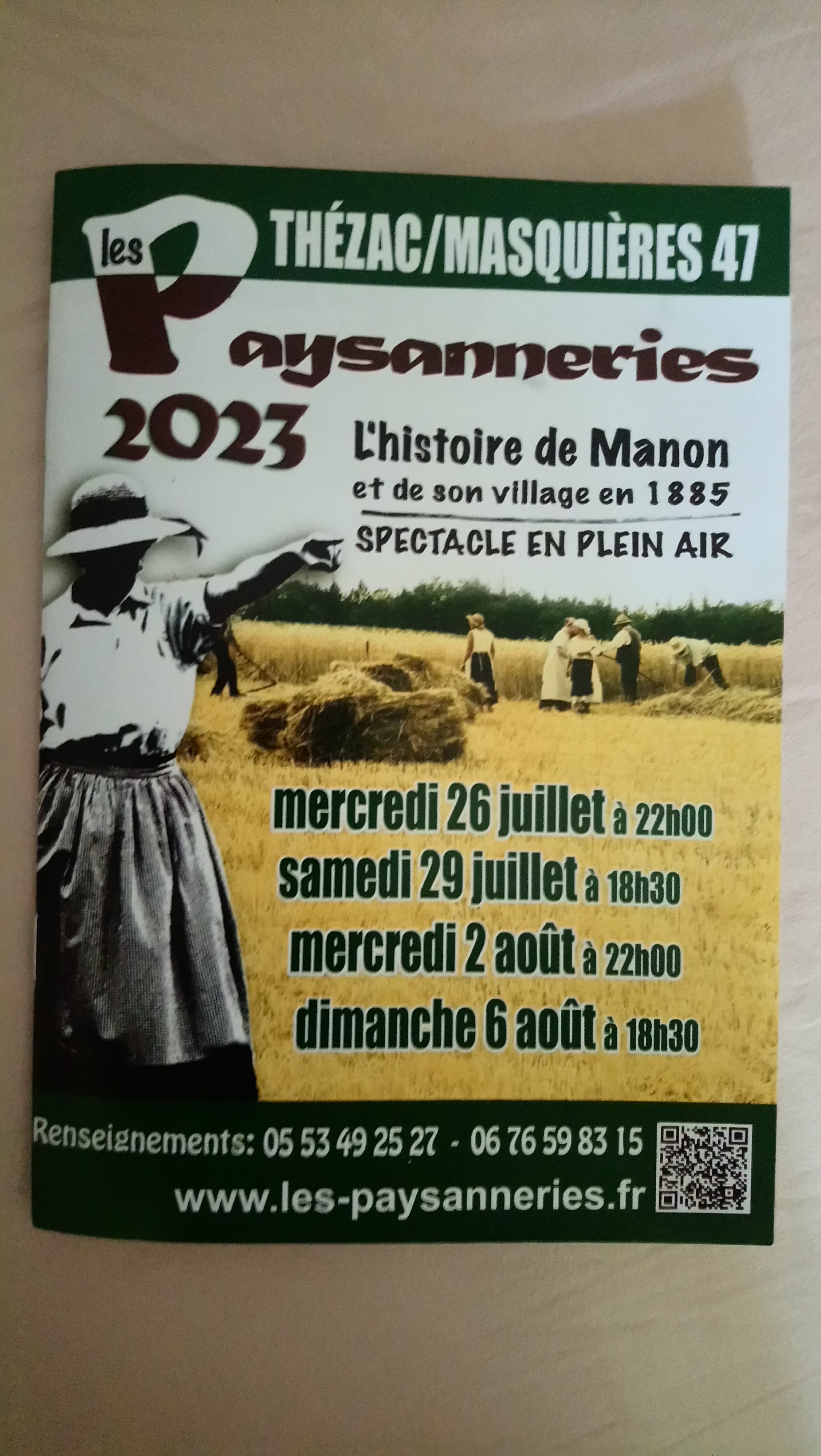 Charmante représentation d un monde d un autre temps mais pas si loin que ça. Mais!! Représentation de la fin du 19 siecle. Prévu l apres midi pour que tout le monde puisse y assister sans projecteurs. Suivi d un très bon repas avec les victuailles de la terre. Et une ambiance musicale dont certaines personnes ont apprécié en dansant sur l herbe alentour entre les chaises et tables. Ce divertissement terriens était à Thezac. Dans le département du Lot et Garonne