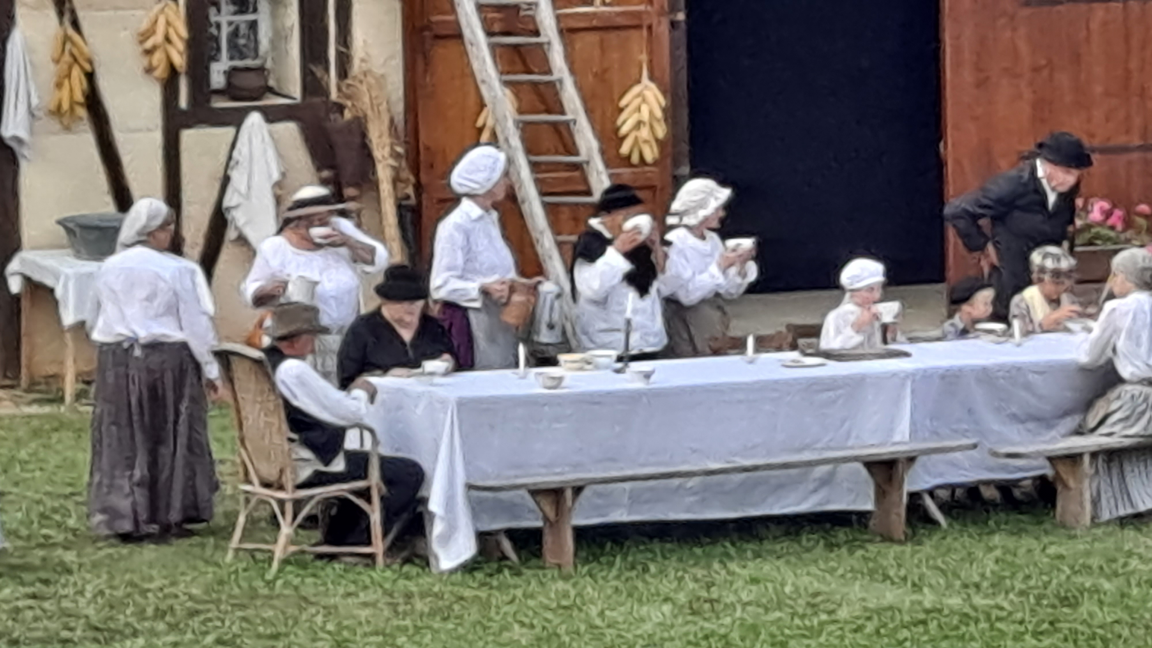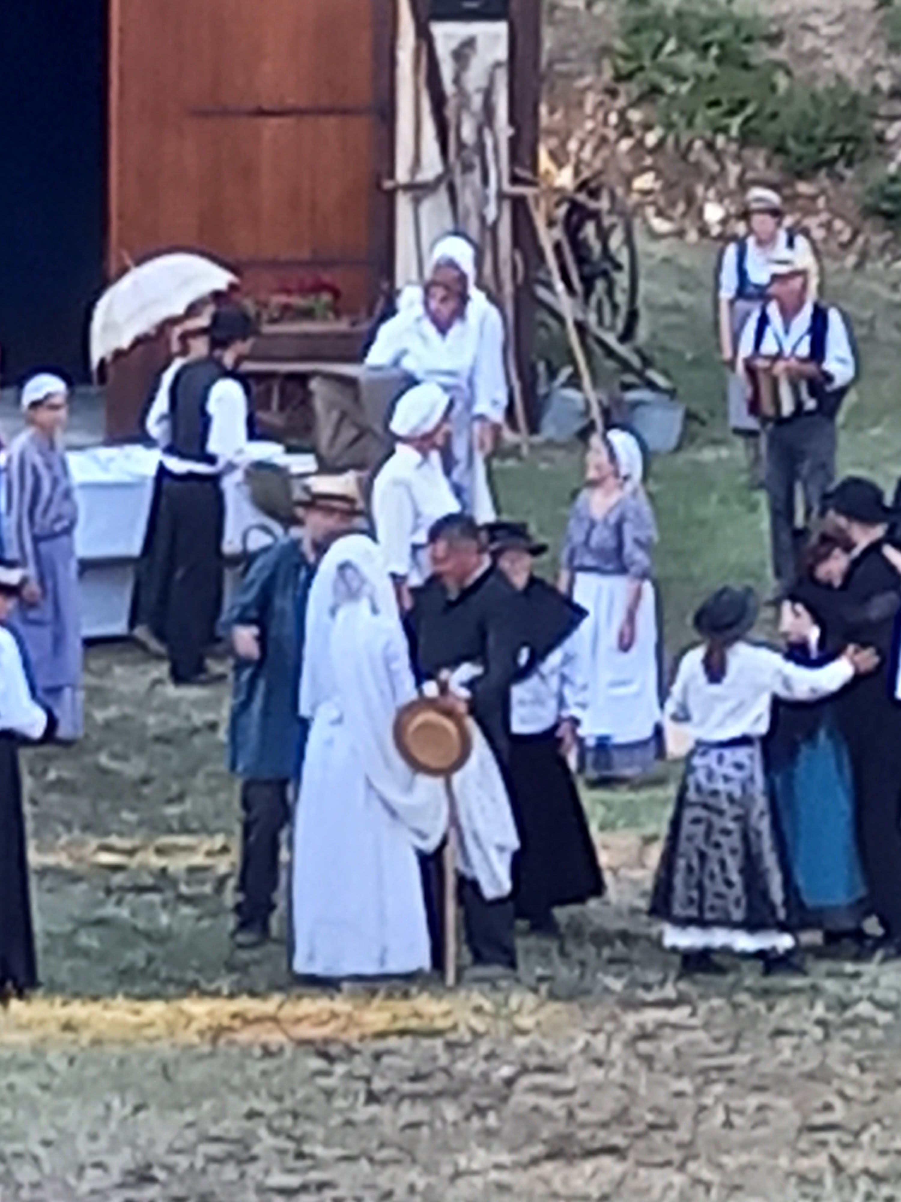 Un très beau spectacle en plein air nous est offert par l'association Gens de terroirs qui nous raconte l'histoire de Manon et de son village en 1885. Et défilent devant nos yeux tous les acteurs de la vie quotidienne : femmes qui s'activent aux premières lueurs du jour, enfants sur le chemin de l'école, désormais gratuite et laïque, paysans aux travaux des champs. Mais aussi tous les métiers périphériques : gendarmes, colporteurs, bergers, garde champêtre, rémouleur... sans oublier le curé qui officie aux petits et grands moments de la vie... baptêmes, mariages... seule la mort ne sera pas mise en scène... peur de refroidir l'ambiance ? Il n'empêche que ces Paysanneries, seizièmes du nom sont une superbe réussite tant par le spectacle lui-même que dans ses coulisses à commencer par le fléchage du parcours, le parcage des voitures jusqu'à l'organisation du méga repas campagnard, beau temps inclus ! Chapeau les artistes !